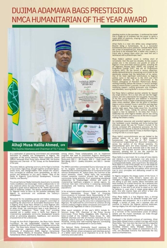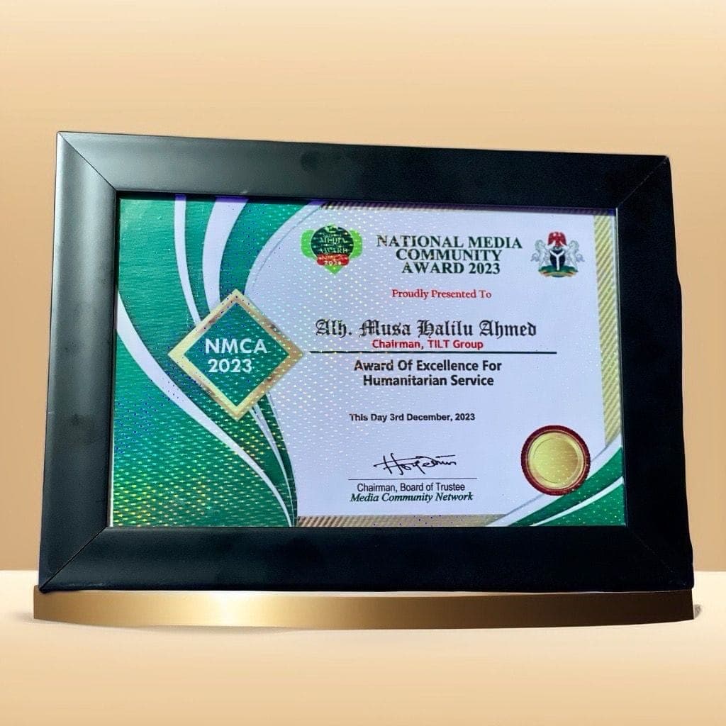 In a celebration of unwavering commitment and remarkable dedication to stability and development in Nigeria, the organisers of the annual National Media Community Award (NMCA) honoured Alhaji Musa Halilu Ahmed OFR, the Dujima Adamawa and Chairman of TILT Group, as the Humanitarian of the year.