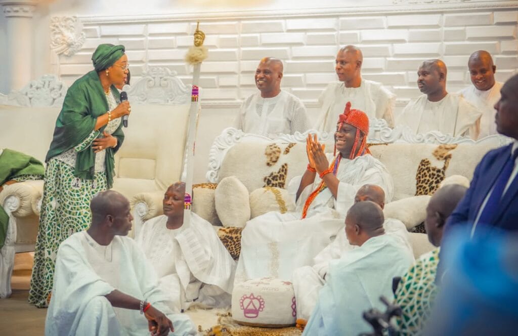 She noted that all hands must be on deck and join with the Federal Government in its pursuit of a greater nation in support of the education sector and infrastructure renewal as being exemplified by the Ooni of Ife, Oba Enitan Adeyeye Ogunwusi with the building of the hostels and the road”.
