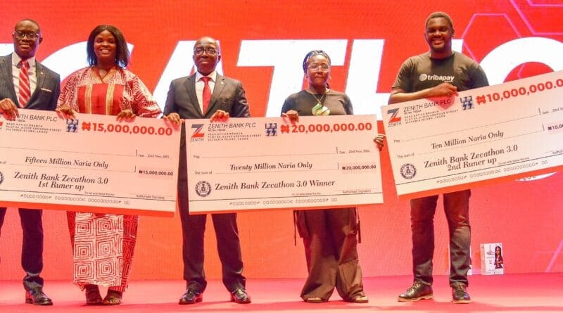 L-R: Group Managing Director/CEO, Zenith Bank Plc, Dr. Ebenezer Onyeagwu (Centre) flanked from left by Executive Director, Zenith Bank Plc, Dr. Temitope Fasoranti; Founder, Skill up with Kahdsole (SUWK), Chioma Ukpabi; Co-founder, Sync, Princess Edokpayi, and Co-founder/CEO, Tribapay, Bolu Oluwagbesan during the presentation of cash prizes to the winners of the Zecathon at the Zenith Tech Fair 3.0 held at Eko Convention Centre, Eko Hotels & Suites, Victoria Island, Lagos, yesterday.