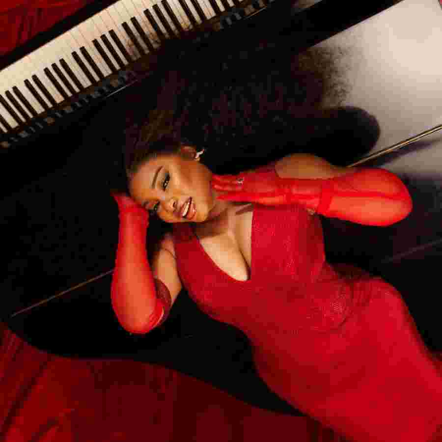 Dressed in fitted red gown and gloves, Alade exuded confidence and class against a backdrop of a red curtain, with a keyboard casting a warm glow.