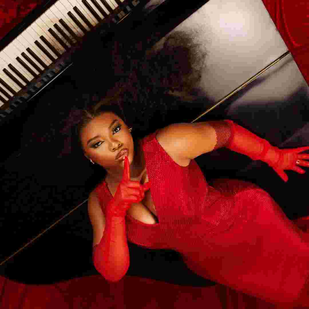 Dressed in fitted red gown and gloves, Alade exuded confidence and class against a backdrop of a red curtain, with a keyboard casting a warm glow.