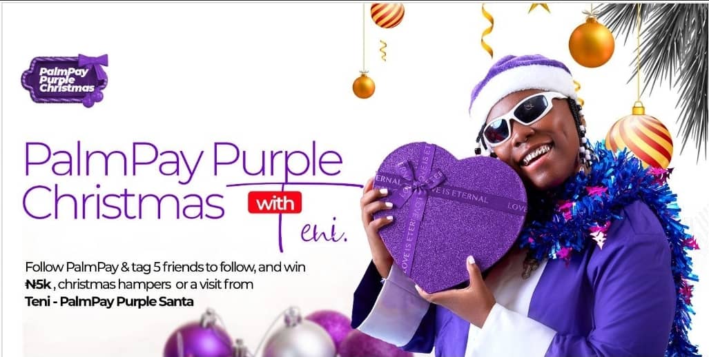 To win Free Cash and a Hamper Users are to follow @PalmPay Nigeria on social media, comment with “what they want for Christmas,” and tag 5 of their friends using the #PalmPayPurpleChristmas and #PalmPayXTeni hashtags.