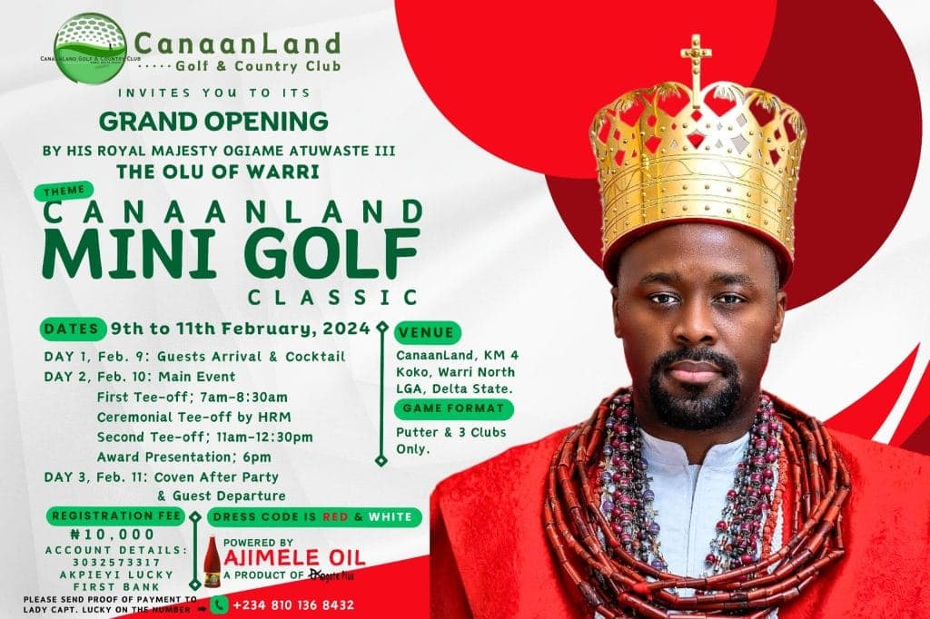 “The Olu of Warri, His Royal Majesty, Ogiame Atuwatse, is also set for the Canaan Land Mini Golf Classic ceremonial tee-off. Professional and amateur golfers, prominent chiefs, business moguls and top government officials from across the country will join His Royal Majesty in Koko, headquarters of Warri North Local Government on Saturday, February 10, 2024,’’ the statement said.