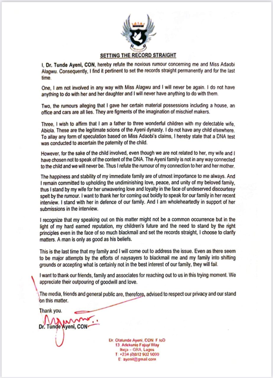 I, Dr Tunde Ayeni CON, hereby refute the noxious rumour concerning me and one Miss Adaobi Alagwu. Consequently, I find it pertinent to set the records straight permanently and for the last time.