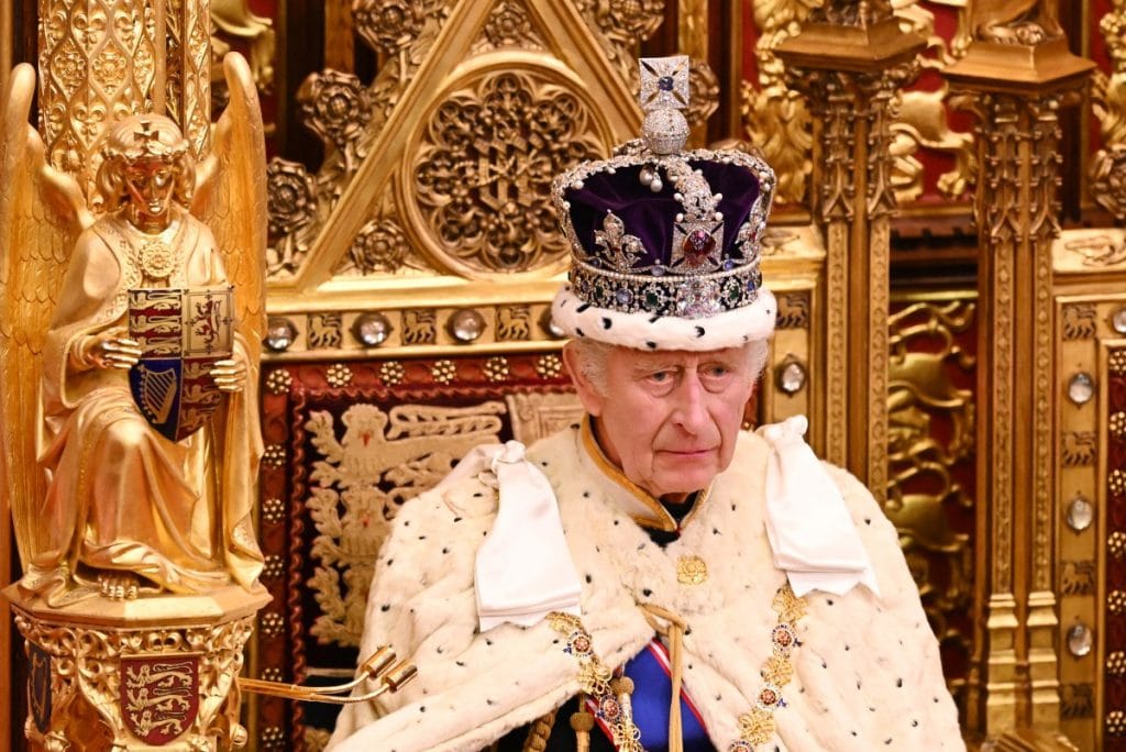 (FILES) Britain’s King Charles III, wearing the Imperial State Crown and the Robe of State, sits on The Sovereign’s Throne in the House of Lords chamber, during the State Opening of Parliament, at the Houses of Parliament, in London, on November 7, 2023. – (Photo by Leon Neal / POOL / AFP)