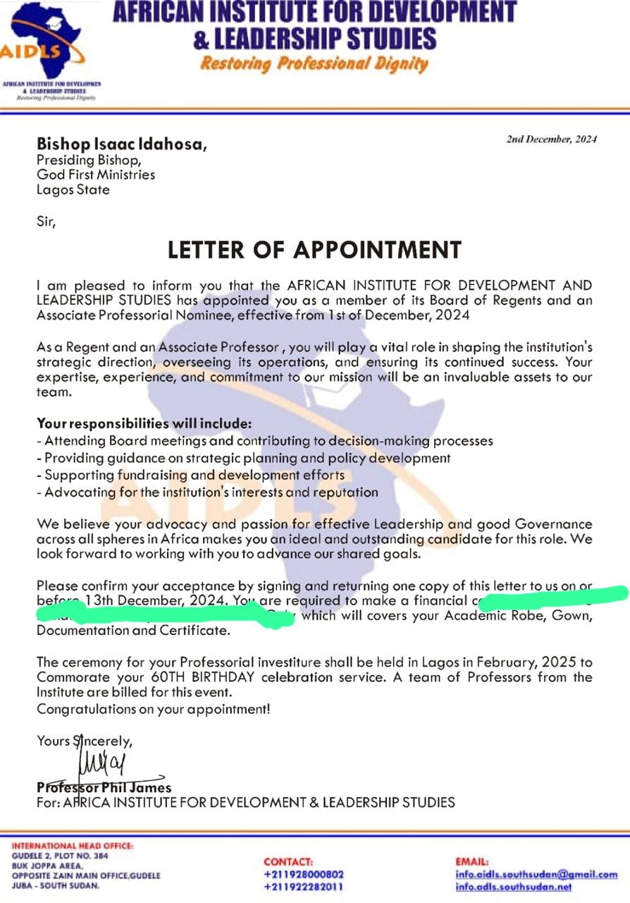 In a related development, the African Institute for Development and Leadership Studies appointed His Excellency, Archbishop Designate Bishop Isaac Idahosa, as a member of its Board of Regents and an Associate Professorial Nominee, effective December 1st, 2024. In this role, Bishop Idahosa will play a vital part in shaping the institution’s strategic direction, overseeing its operations, and ensuring its continued success. His expertise, experience, and commitment to the institute’s mission will be invaluable assets to the team.
