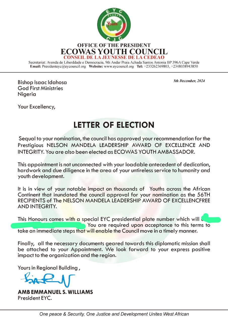 In a letter from the Office of the President of the Ecowas Youth Council, it was stated that the council approved Bishop Idahosa’s nomination in recognition of his “notable impact on thousands of youths across the African continent.” The letter went on to praise Bishop Idahosa’s “untireless service to humanity and youth development.”