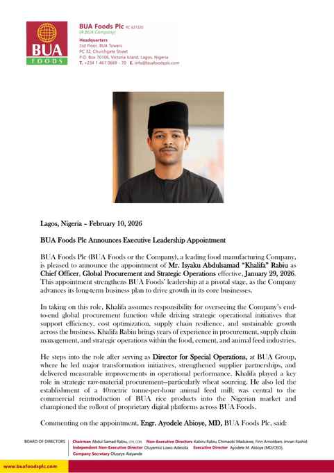 BUA Foods Plc, a leading Nigerian food manufacturer, has appointed Isyaku Abdulsamad “Khalifa” Rabiu as Chief Officer, Global Procurement and Strategic Operations, effective 29 January 2026.