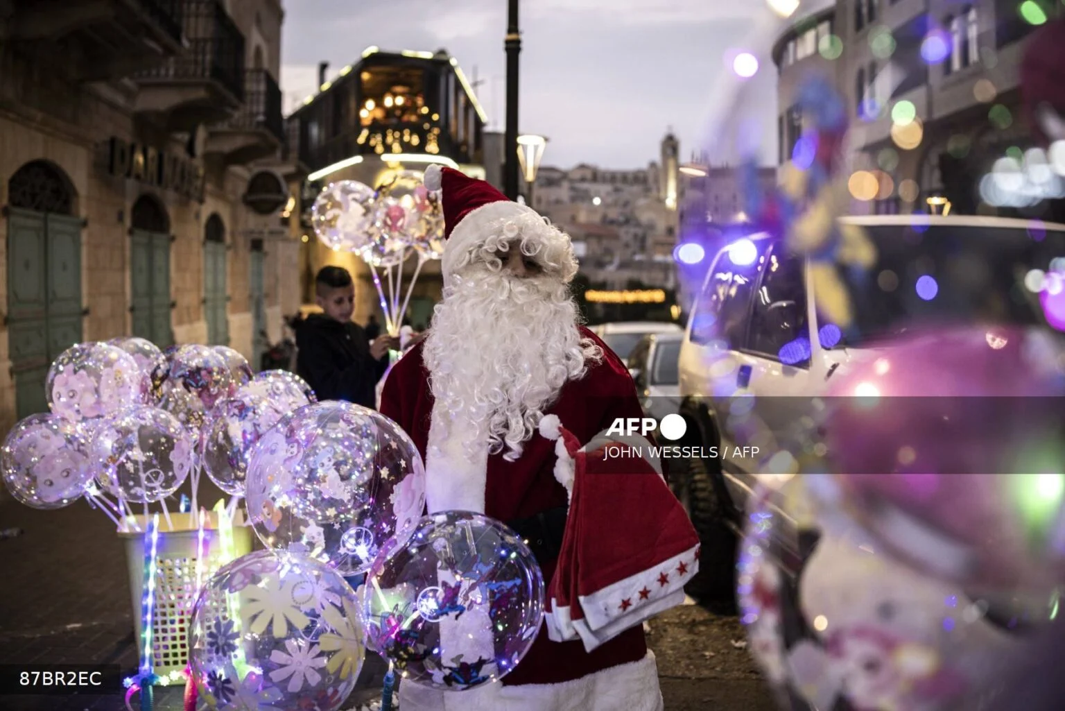 A man dressed as Santa Claus sells balloons near Nativity Square during a Christmas tree lighting ceremony in Bethlehem, in the Israeli-occupied West Bank, on December 6, 2025. (Photo by JOHN WESSELS / AFP)