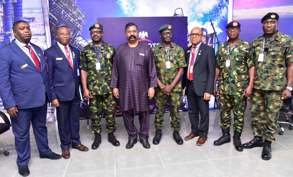 L-R: Member of Faculty, National Defence College, Dr. Terwase Isaac Sampson; Member of Faculty, National Defence College, Air Vice Marshal, Emmanuel Chukwu; Team Coordinator, National Defence College, Brig. Gen. Chukwuemeka Michael Akaliro; Vice President, Oil and Gas, Dangote Industries Limited, Devakumar Edwin; Team Leader, National Defence College, Brig. Gen. Muhammed Sani Usman; Member of Faculty, National Defence College, Dr. Chinedu Udeh; Member of Faculty, National Defence College, Brig. Gen. Emere Edwin Chukwumezie; Member of Faculty, National Defence College, Commodore Abidemi Adebayo Abu, during the National Defence College, Course 33 visit to Dangote Petroleum Refinery and Fertiliser Plant, Lekki Lagos on Tuesday, December 3, 2024