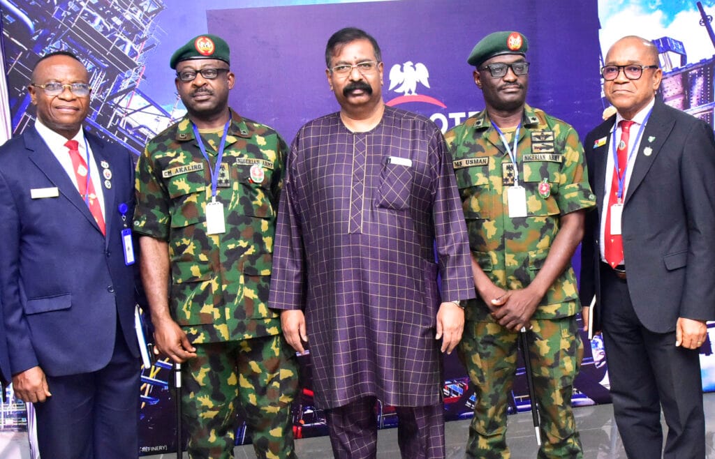 L-R: Member of Faculty, National Defence College, Air Vice Marshal, Emmanuel Chukwu; Team Coordinator, National Defence College, Brig. Gen. Chukwuemeka Michael Akaliro; Vice President, Oil and Gas, Dangote Industries Limited, Devakumar Edwin; Team Leader, National Defence College, Brig. Gen. Muhammed Sani Usman; Member of Faculty, National Defence College, Dr. Chinedu Udeh; Member of Faculty, National Defence College, Brig. Gen. Emere Edwin Chukwumezie, during the National Defence College, Course 33 visit to Dangote Petroleum Refinery and Fertiliser Plant, Lekki Lagos on Tuesday, December 3, 2024