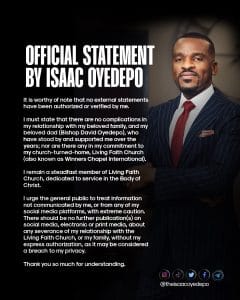 He said in part, ““I must state that there is no complication in my relationship with my beloved family and my beloved dad ( Bishop David Oyedepo) who has stood by me and supported me over the years nor are there any in my commitment to my church-turned-home, Living Faith Church, also known as Winners Chapel International.