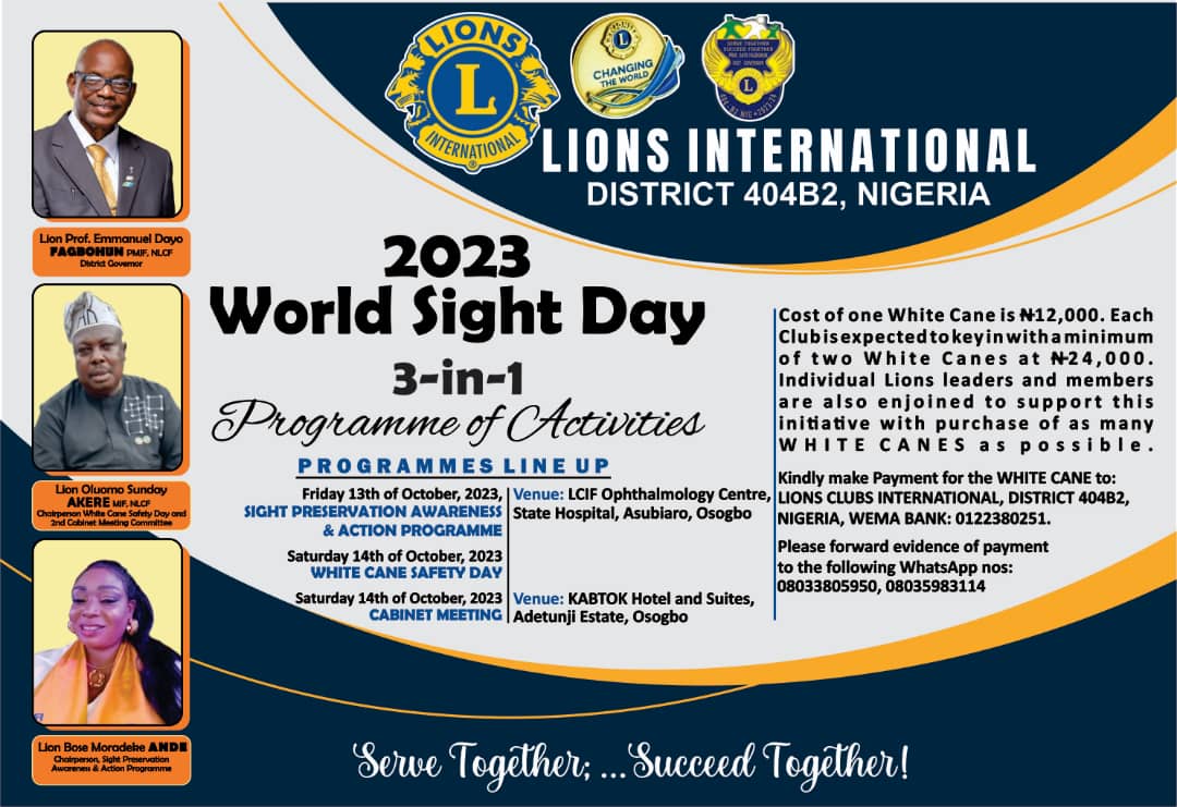 Members of Lions Clubs International District 404B2 Nigeria are set to commemorate the 2023 World Sight Day coming up on Thursday 12th of October, 2023 with series of activities geared towards fighting the scourge of blindness and other related eye diseases in our environment.