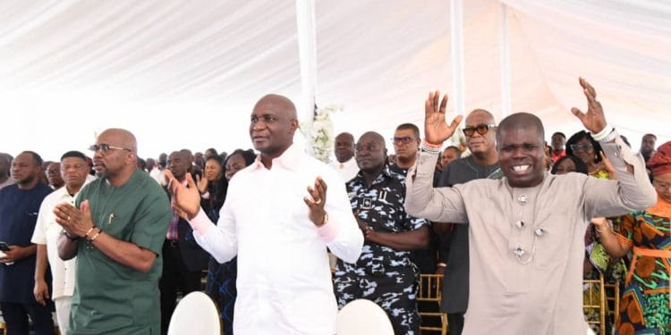 With him are the NDDC Executive Director of Finance and Administration, Alabo Boma Iyaye (left), and the Director of Administration and Human Resources, Patrick Ekade (right), NDDC Managing Director, Dr Samuel Ogbuku (middle) as they praised God at the annual End-of-Year Thanksgiving Service at the Commission’s Headquarters in Port Harcourt.