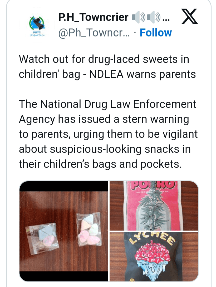 The National Drug Law Enforcement Agency (NDLEA) has alerted parents to watch out as drug-laced sweets, chocolates, and snacks disguised as treats are increasingly being found in children’s bags and pockets.