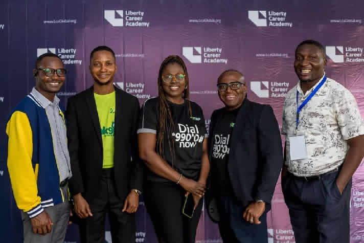 Caption: L-R: Solomon Olowe, LCA Nigeria; Alvin Afadama, PR Specialist, 9PSB; Oludara Ogunbowale, Brands & Corporate Communications Lead, 9PSB; Jesse Okpara, Agent Merchant & Acquisition Officer, 9PSB, Oputah David, LCA Nigeria at the financial literacy training session at Liberty Career Academy Summer Camp held recently