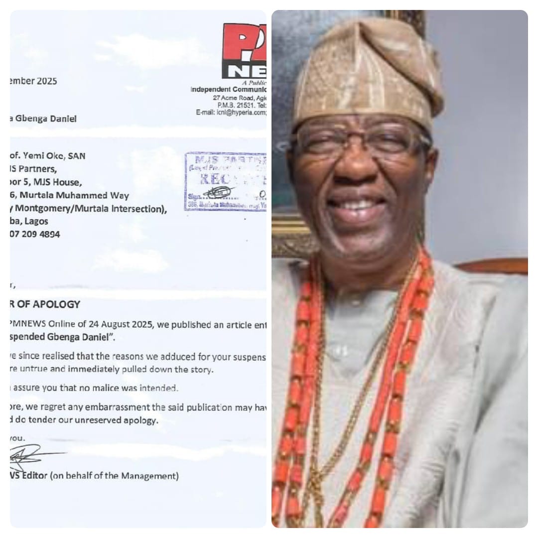 PM News has issued a public apology to former Ogun State governor and serving senator, Otunba Gbenga Daniel, over what it described as a false and misleading publication regarding his alleged suspension from the All Progressives Congress (APC).