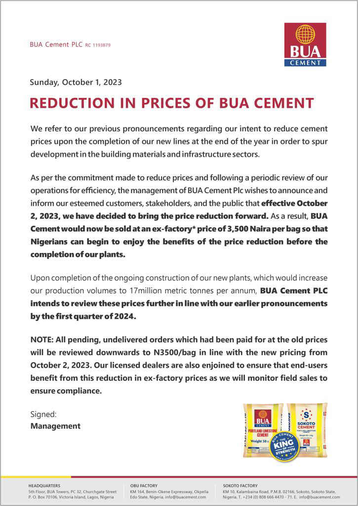 BUA Group has decided to bring down the price of Cement effective October 2, 2023.