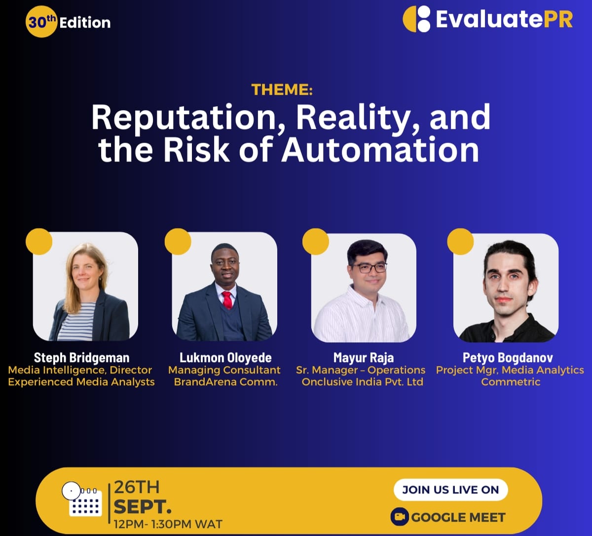 Since its launch, EvaluatePR has become a global thought-leadership platform where communications, PR, and media experts debate the future of measurement and evaluation. The September edition will bring together seasoned voices, including Steph Bridgeman, Media Intelligence Director at Experienced Media Analysts; Lukmon Oloyede, Managing Consultant at BrandArena Communications; Mayur Raja, Senior Manager, Operations at Onclusive India; and Petyo Bogdanov, Project Manager, Media Analytics at Commetric. These experts will unpack the realities of an industry at the crossroads of human judgment and machine intelligence.