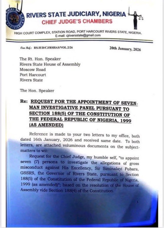 In a letter dated 20th January 2026, addressed to the Speaker of the Rivers State House of Assembly, Martins Amaewhule, Justice Amadi cited two court orders barring him from receiving, forwarding, or considering any requests to form such a panel.