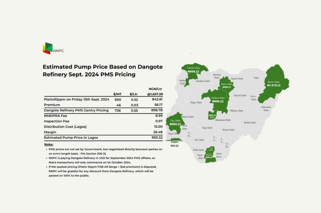 “NNPC Ltd Releases Estimated Pump Prices of PMS from Dangote Refinery, Based on September 2024 Pricing.