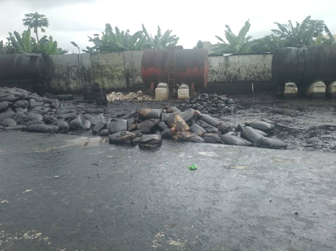 Emekus Nigeria Limited is located at Umuebule axis of Oyigbo while the piggery is located at a remote axis east of the bank of the Imo River. Bags of stolen crude awaiting refining, 3 tanks of different capacities and a 33,000-litre truck, among others were seen at Emekus Nigeria Limited.