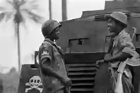 FILE: Two children soldiers of the Biafran army, Moise, 14 (L) and Ferdinand, 16 (R) discuss in Umuahia on August 31, 1968 as the Nigerian federal troops continue their advance during the Biafran war. / AFP PHOTO / Francois Mazure