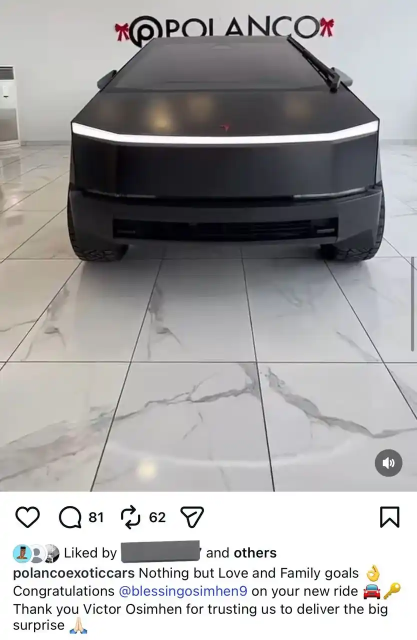 Victor Osimhen has gifted his sister, Blessing Osimhen, a Tesla Cybertruck Foundation Series.