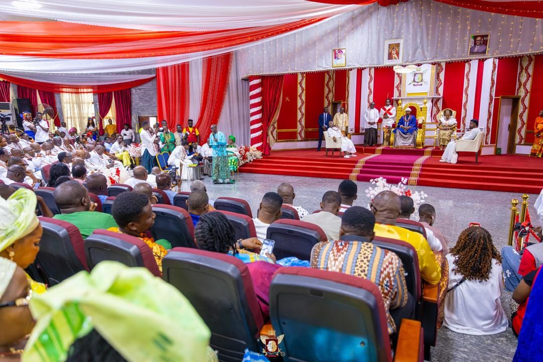 The Olu of Warri Kingdom, HRM. Ogiame Atuwatse III, flanked by his Queen, Olori Atuwatse III, later offered prayers to his subjects, including palace chiefs, who greeted him as tradition demands.