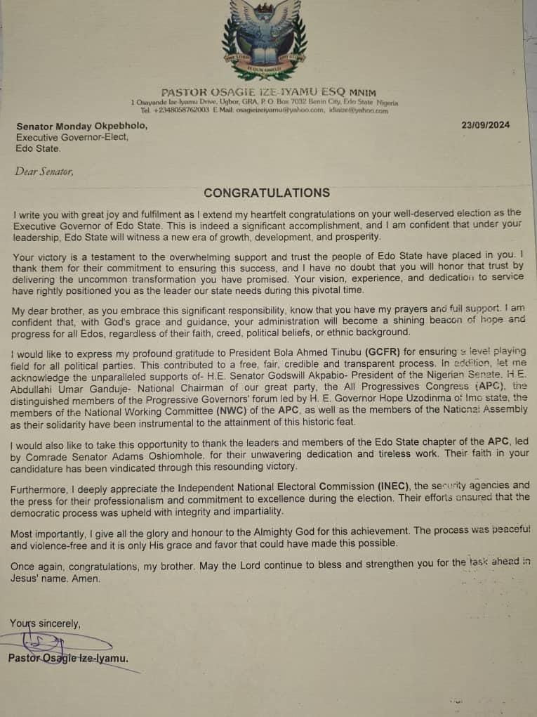 I write you with great joy and fulfilment as I extend my heartfelt congratulations on your well-deserved election as the Executive Governor of Edo State. This is indeed a significant accomplishment, and I am confident that under your leadership, Edo State will witness a new era of growth, development, and prosperity.