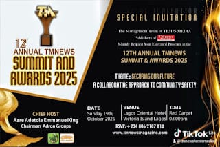 The 12th Annual TMnews Summit & Awards will hold on Sunday, October 19, 2025, at the Lagos Oriental Hotel, Victoria Island, with the theme: “Securing the Future: A Collaborative Approach to Community Safety.”