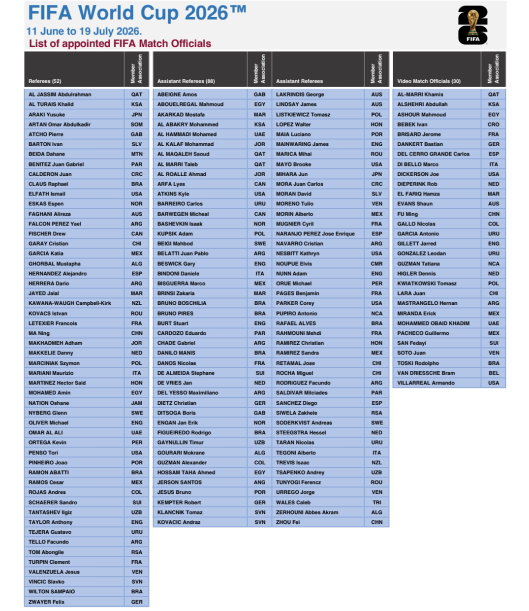 As part of preparations, FIFA unveiled its final list of match officials, comprising 52 referees, 88 assistant referees, and 30 video match officials drawn from all six confederations and 50 Member Associations.