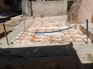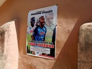 A giant-size mural of Osimhen in the Eagles regalia could be seen beside a placard of memorabilia made by the community elders. Above it sat an illustration of Osimhen’s boot with the tagline: “Olusosun to the world”.