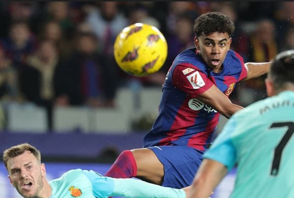 #27 Lamine Yamal (2nd R) kicks the ball during the Spanish league football match between FC Barcelona and RCD Mallorca at the Estadi Olimpic Lluis Companys in Barcelona on March 8, 2024. Photo: LLUIS GENE/AFP
